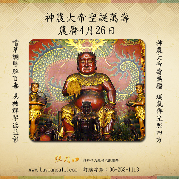 農曆四月二十六日是農民、中醫藥商的守護神—神農大帝誕辰,各地奉祀神農氏的廟宇都會舉行祭典,其中以三重先嗇宮、台南神農殿和宜蘭神農宮規模較大。